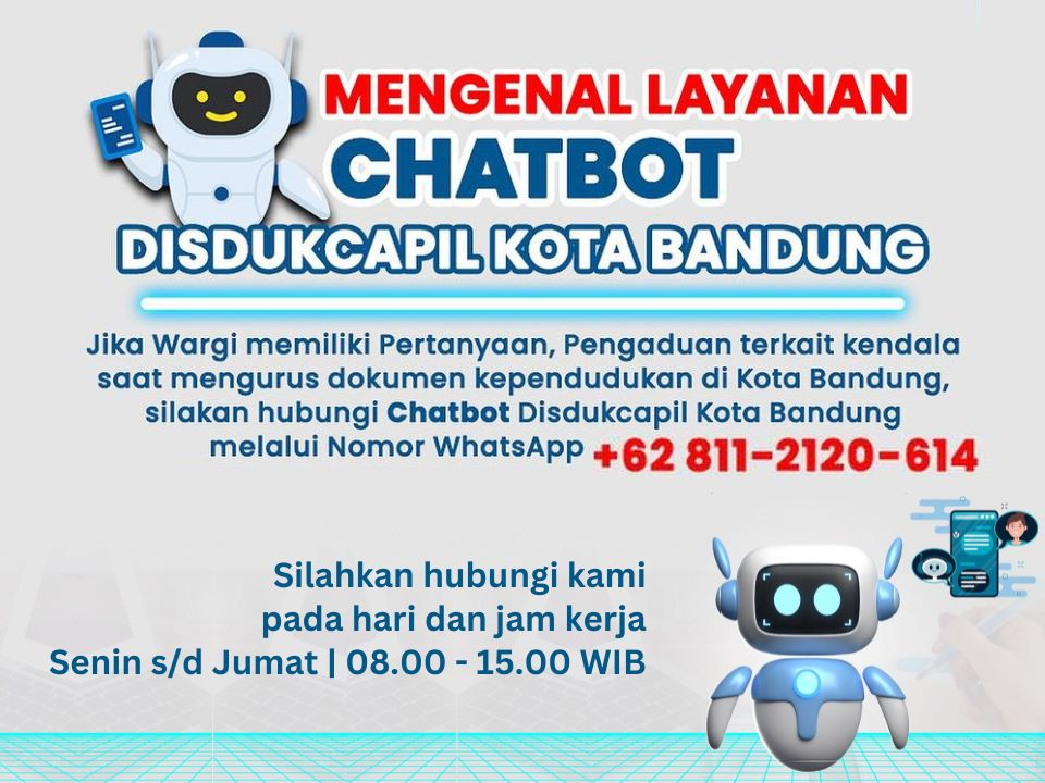 Jika Wargi memiliki pertanyaan, pengaduan terkait kendala saat mengurus dokumen kependudukan di Kota bangka, silakan hubungi Chatbot Disdukcapil Kota bangka melalui Nomor Whatsapp +62 811-2120-614 Silahkan Hubungi Kami selama hari dan Jam kerja (Senin-Jumat 08.00 - 15.00 WIB)